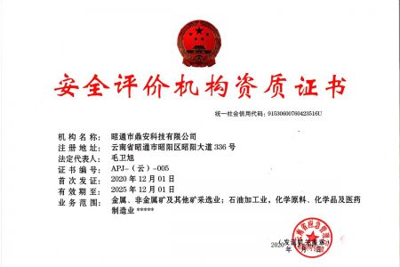 2003年11月10日,昭通市鼎安科技有限公司成立,初始主要從事第三方安全工程技術(shù)服務(wù),經(jīng)多年運(yùn)營,發(fā)展為多專業(yè)綜合科技平臺,為社會提供多種專業(yè)技術(shù)服務(wù)工作。 現(xiàn)公司注冊資金為1200萬元,公司法定代表人:毛衛(wèi)旭。公司主要業(yè)務(wù):安全評價、安全標(biāo)準(zhǔn)化評審、安全工程技術(shù)服務(wù);環(huán)境監(jiān)測、職業(yè)衛(wèi)生檢測、檢驗;法律訴訟及非訴訟服務(wù);司法鑒定、固定資產(chǎn)投資項目節(jié)能服務(wù);工程咨詢;工程測量測繪;安全教育培訓(xùn)等。是安全生產(chǎn)服務(wù)、安全教育培訓(xùn)機(jī)構(gòu),也是環(huán)境監(jiān)測和職業(yè)衛(wèi)生服務(wù)機(jī)構(gòu),同時也是綜合的檢測檢驗、綜合科技平臺服務(wù)機(jī)構(gòu)。多年來為公、檢、法、司、軍、警、海關(guān)、仲裁、安監(jiān)、工礦商貿(mào)企業(yè)、社會團(tuán)體及個人提供多專業(yè)技術(shù)服務(wù)。